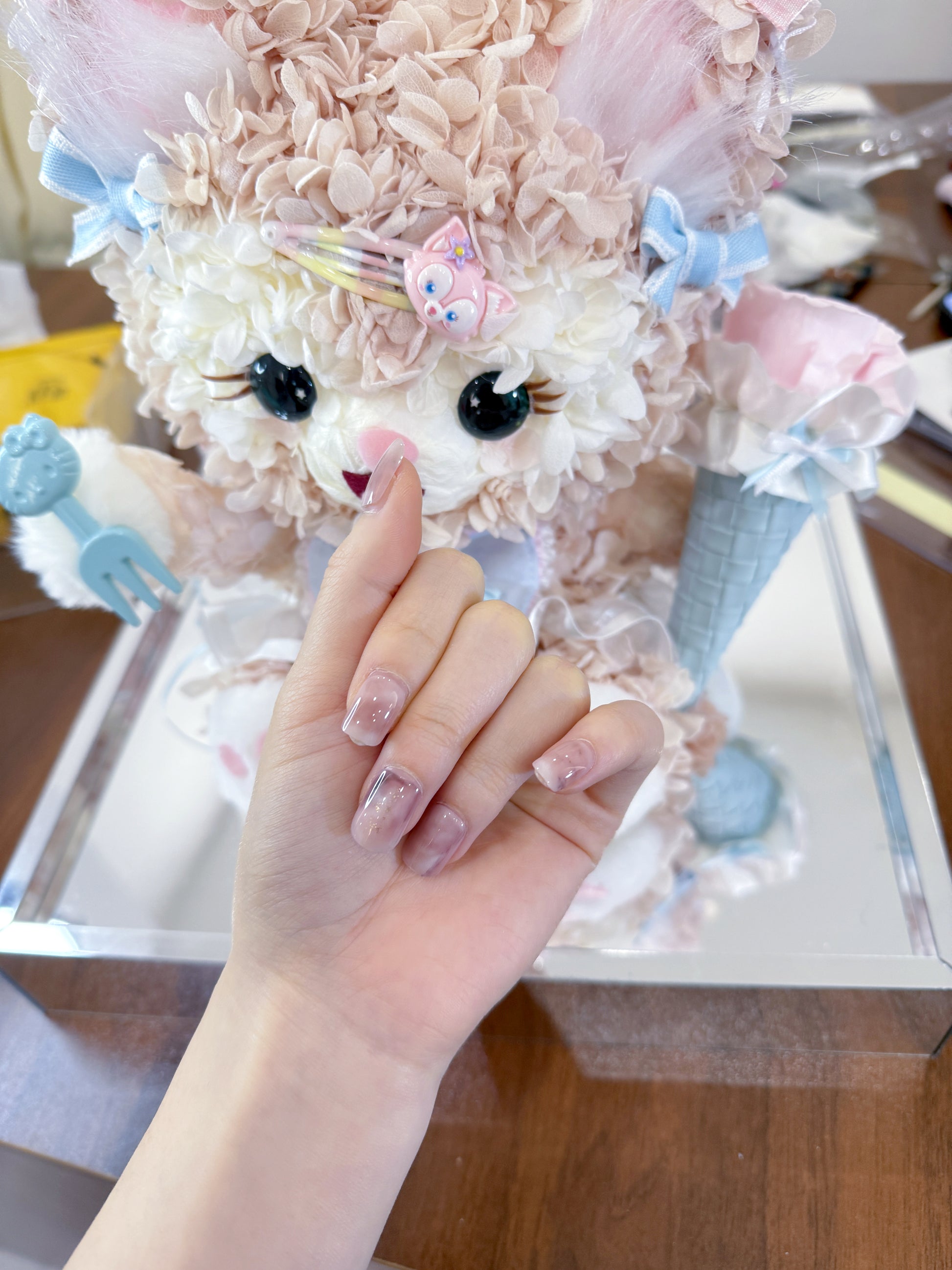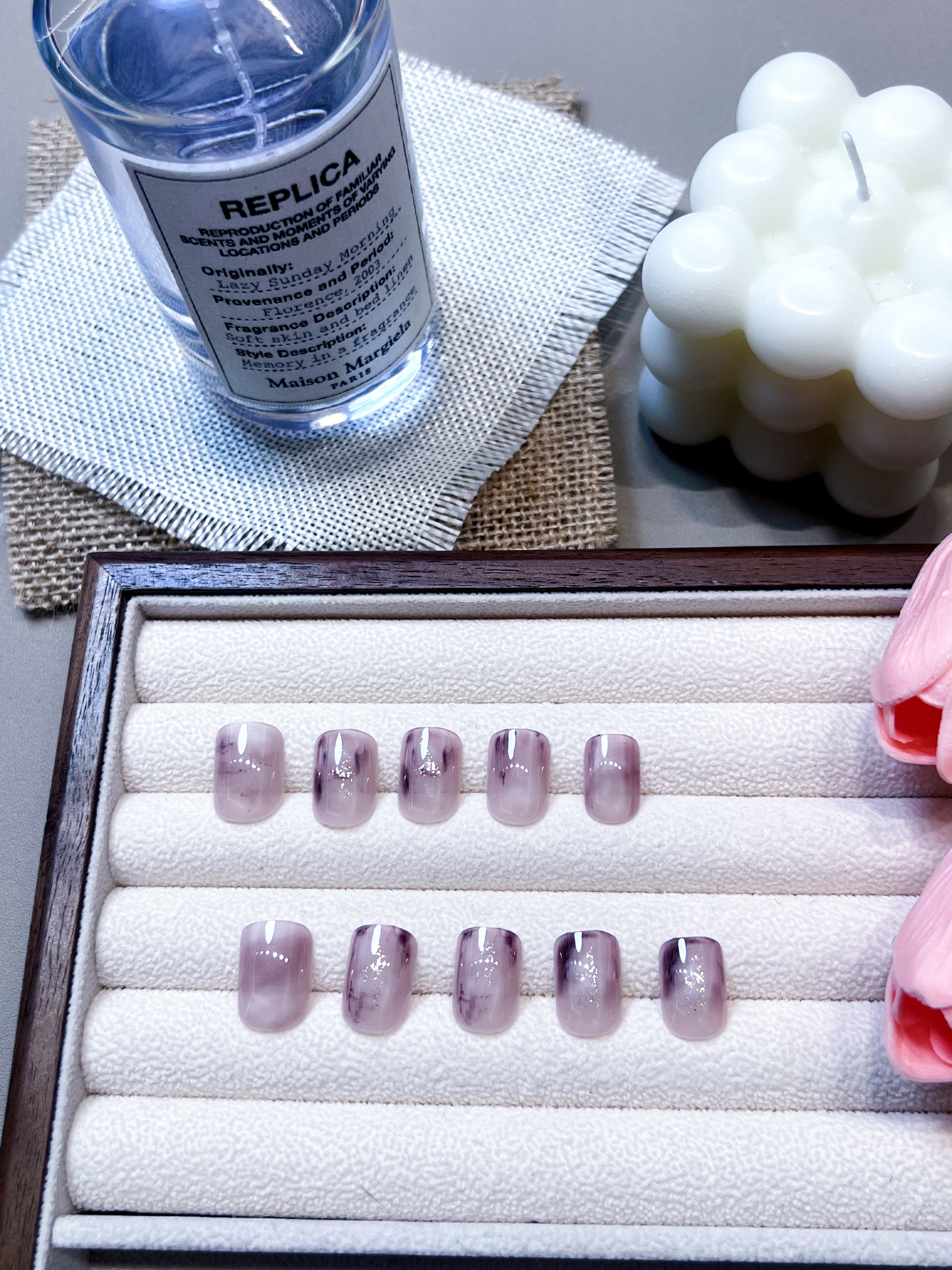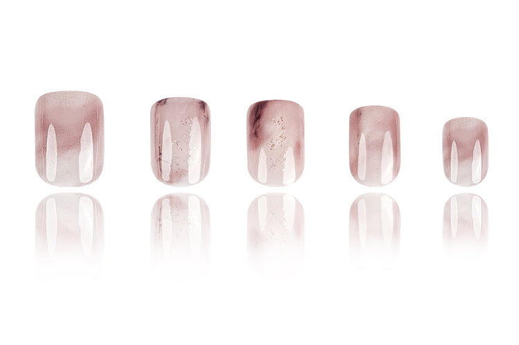 柔らかなモーヴカラーを基調としたグラデーションデザインが特徴です。控えめな光沢が加わり、上品で洗練された指先を演出します。どんなシーンにもマッチする落ち着いたデザインです。