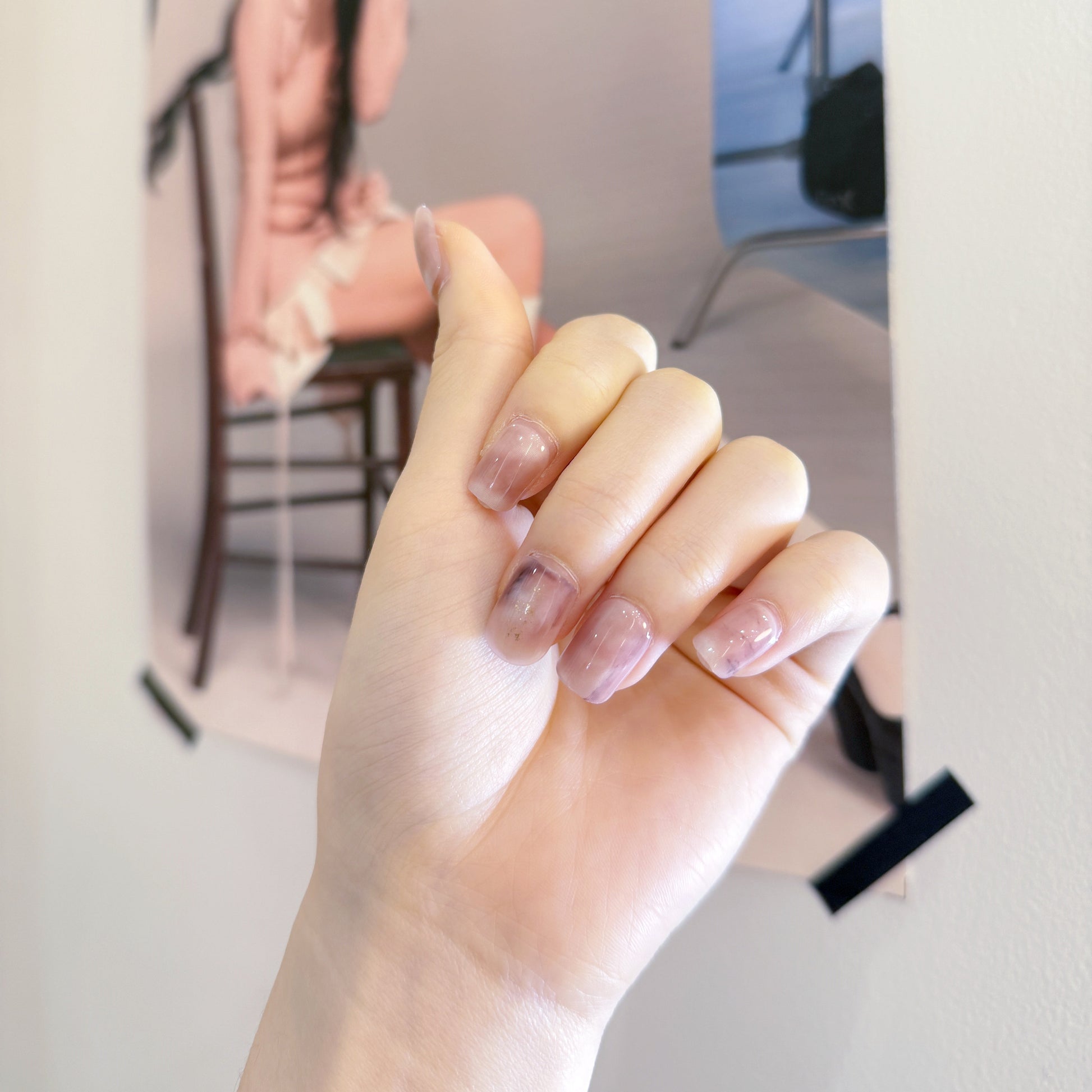 柔らかなモーヴカラーを基調としたグラデーションデザインが特徴です。控えめな光沢が加わり、上品で洗練された指先を演出します。どんなシーンにもマッチする落ち着いたデザインです。